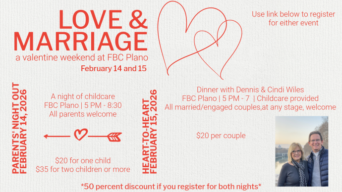 Join us for a special Valentine's weekend celebrating love & marriage at FBC Plano. There are two separate events; you can participate in either, or both! Parents...
